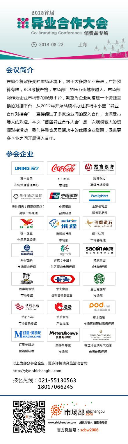 由市場(chǎng)部網(wǎng)聯(lián)合多家知名品牌企業(yè)主辦的“2013首屆異業(yè)合作大會(huì)”將于8月22日在上海召開(kāi),大會(huì)將以資源對(duì)接的方式促進(jìn)企業(yè)間達(dá)成異業(yè)合作,實(shí)現(xiàn)低成本、高效率的品牌推廣。本屆大會(huì)主要面向消費(fèi)品類(lèi)企業(yè),目前包括可口可樂(lè)、蘇寧云商、利潔時(shí)家化、招商銀行、漢庭酒店、統(tǒng)一食品、鉆石小鳥(niǎo)等50多家國(guó)內(nèi)外知名企業(yè)已報(bào)名參加,預(yù)計(jì)將吸引近200家消費(fèi)品企業(yè)參與。據(jù)悉會(huì)議當(dāng)天,利潔時(shí)家化營(yíng)銷(xiāo)總監(jiān)譚奕將分享利潔時(shí)旗下品牌杜蕾斯、滴露等經(jīng)典異業(yè)合作案例,蘇寧云商市場(chǎng)策劃管理中心程谷明先生將為大家分享蘇寧的異業(yè)合作資源,跨界營(yíng)銷(xiāo)案例。