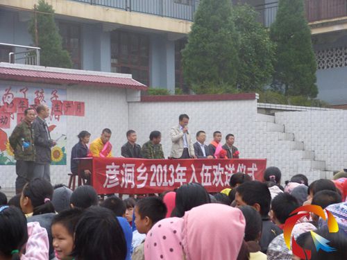 9月4日上午8點,彥洞鄉(xiāng)在黃門民族中學(xué)舉行2013年度新兵入伍歡送儀式,鄉(xiāng)領(lǐng)導(dǎo)班子、入伍新兵、新兵家長、黃門村兩委成員、黃門村腰鼓隊及群眾到場歡送。
