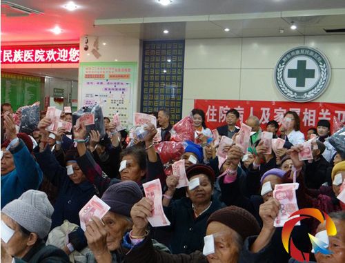 圖為錦屏白內障患者手術后喜領生活補助費現場