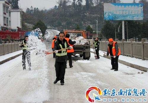 受強(qiáng)冷空氣的影響,自2012年12月底以來,黔東南州出現(xiàn)持續(xù)低溫雨雪及凝凍天氣,導(dǎo)致境內(nèi)干線公路上結(jié)凝嚴(yán)重。凱里公路管理局全面進(jìn)入抗凝保通應(yīng)急狀態(tài),晝夜連續(xù)奮戰(zhàn)10余天,搶通被“凍斷”路段40余次。截至1月7日17時(shí),已累計(jì)出動(dòng)人員1060人次、搶險(xiǎn)車輛147臺(tái)次,撒融雪鹽125余噸、防滑砂1269立方米。