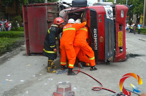 10時55分,凱里市消防大隊特勤中隊官兵接警趕到現(xiàn)場后,發(fā)現(xiàn)大貨車側(cè)翻在路邊,車載水泥散落一地,造成交通擁堵,駕駛員被死死卡在駕駛室內(nèi)。
