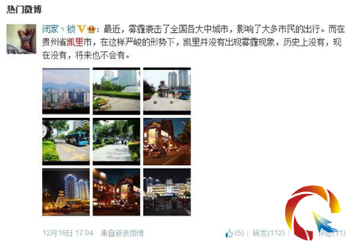 最近網(wǎng)上一條熱門微博,引起記者的關(guān)注,此微博說明了最近霧霾天氣給市民帶來了一定的影響,但在貴州省凱里市,并沒有出現(xiàn)霧霾現(xiàn)象,可見凱里的原生態(tài)環(huán)境存在較強(qiáng)的優(yōu)勢。