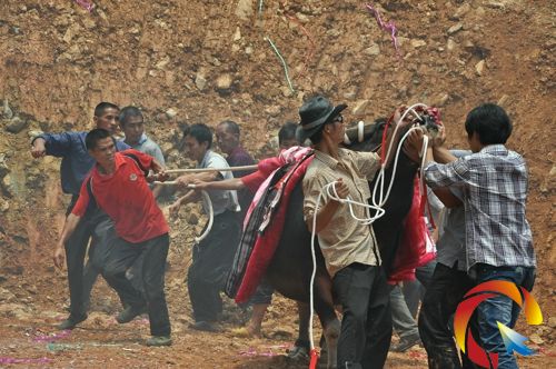 當天,是當地各村寨牽水牛進塘的第一天,牛現塘之后,客人便來祝賀,然后,主人邀約客人,返家喝酒唱歌。據了解,當地苗、侗族同胞六年一次的牯藏節將于2014年10月舉行。(楊代富 羅茜)