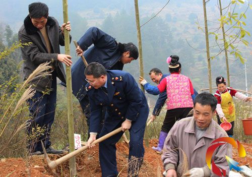 又是一年春來到。3月12日,雷山縣政府組織縣工商局、企業、個體工商戶等縣直各機關部門1000多名黨員干部職工在縣城馬家屯景區以塑造“森林之城、休閑勝地”秀美苗嶺,義務種植桂南木蓮、樂昌含笑、香樟、紅豆杉、桂花等1萬余株樹種。圖為雷山縣工商局等單位干部職工義務植樹的場面。(楊華)