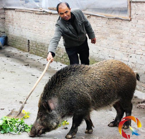貴州省雷山縣腳堯村支書吳先炳在他的野豬養殖基地給他的“先鋒”1號種豬喂食。2012年,他光飼養野豬這一項,年收入超15萬元,60天斷奶的小野豬一頭就賣1800元,育肥野豬每頭6000元左右。目前,他的養殖場共60余頭野豬。(李雪攝)