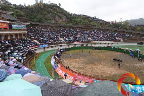 當(dāng)天,有4000余名斗牛愛(ài)好者購(gòu)票觀看,每張票30元。因大家都舉著雨傘,原本1.8萬(wàn)人設(shè)計(jì)的斗牛場(chǎng)都被擠得滿滿當(dāng)當(dāng),場(chǎng)景非常壯觀。斗牛第一天,有全國(guó)46頭B組斗牛參戰(zhàn)。斗牛數(shù)量多,當(dāng)天B組沒(méi)有進(jìn)入決賽,B組的決賽在11月12日上午繼續(xù)舉行。