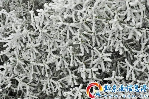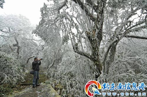 1月7日,由于持續(xù)低溫,位于雷山縣境內(nèi)海拔2178米的雷公山國家森林公園,出現(xiàn)童話般的霧凇、冰柱,晶瑩剔透的玉樹瓊花美景吸引許多游客和攝影愛好者不畏嚴(yán)寒前來觀看。(陳沛亮 攝影報(bào)道)