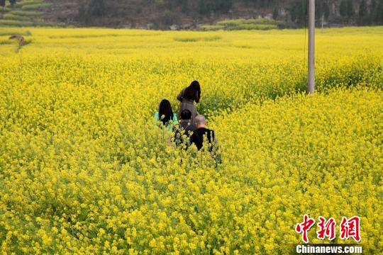 2013貴州 安順(屯堡)油菜花旅游節于3月16日開幕。本次“油菜花”旅游節以“宜居安順、風情屯堡、美麗鄉村”為主題,讓游客在“金海”暢游云峰八寨。圖為暢游“金海”的游客。