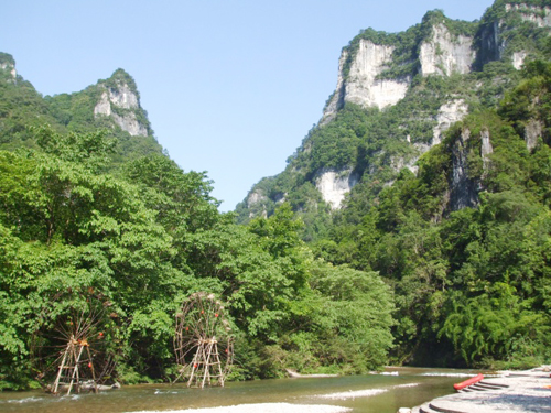 我們?cè)谏寄竞拥膽驯Ю镄凶摺:用鏁r(shí)寬時(shí)窄,河水悠悠流淌,水面清澈見(jiàn)底,砂石歷歷可數(shù)。舉目漫山遍野,兩岸懸崖絕壁,山形變幻莫測(cè),或如仙人指路,或似大佛現(xiàn)身,或有飛來(lái)神像,景色美侖美奐。不知是因了這杉木河的水,山才變得那樣的靈氣?還是因了這山的靈氣,杉木河的水才那樣的晶瑩?