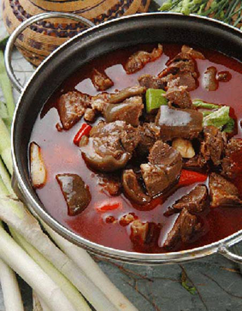 湘西的狗肉火鍋是湘菜中的一大名菜。狗肉火鍋必須選用新鮮壯年狗,加工時經過多次焯水,并投入近20種藥材和調料,因此只感到狗香撲鼻,全無腥膻氣,而且辣得過癮,鮮得“剎渴”。烹調前再加入一味西洋參,不僅能提高火鍋品位,還可平衡狗肉熱性,吃來更加滋補可口。