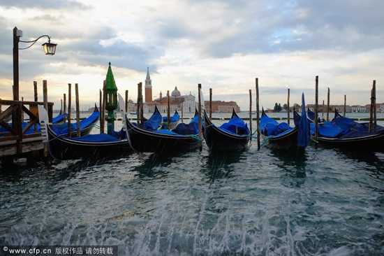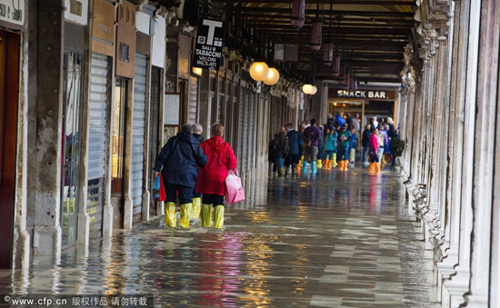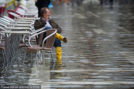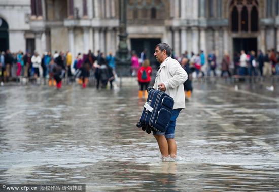 當地時間2013年10月7日,意大利威尼斯,威尼斯迎來秋季首次漲潮,整個城市大街小巷被水淹沒。