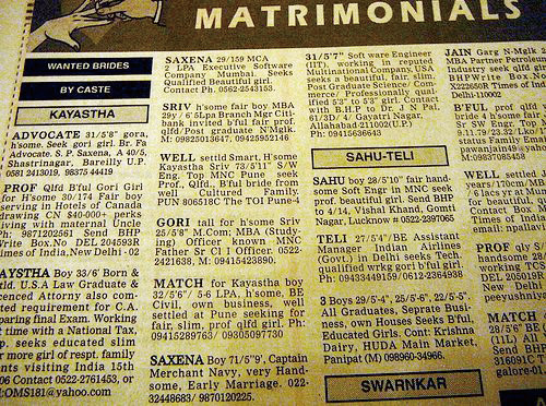 與其他國家一樣,印度的征婚廣告也要注明征婚者的性別、年齡、身高、職業、收入情況等基本信息,并對應征者的相應情況提出一些要求。當然,征婚廣告中不乏一些“印度特色”的元素,比如對種姓和膚色的要求就是一個突出特點,這在幾乎每一條征婚廣告都能看到。許多報紙的征婚專欄干脆就以種姓來歸類。印度教徒占到了印度總人口的80%以上,所以如果征婚者的宗教是印度教就不需要特別點明了。而種姓制度是印度教獨有的,由高到低分為婆羅門、剎帝利、吠舍、首陀羅四大種姓,還有四大種姓之外的“不可接觸者”(即賤民)。印度教規定只有屬于同一種姓的男女才能結婚,跨種姓婚姻是被禁止的。所以,征婚廣告中不要求種姓相同的例子是極少數。如果征婚者對種姓沒有要求,需要注明“種姓無障礙”。