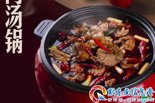 “狗肉湯鍋”是苗族傳統(tǒng)名菜。將狗肉砍成小塊用文火純熟,蓮塘帶汁舀于小鍋內(nèi),架于“三腳”上,下燒炭火。鍋上設(shè)一調(diào)勻“狗肉香”、山萘、辣蓼、芫荽、茴香、麻油、花椒、醬油、醋、味精、辣面等香料的“蘸水”調(diào)味,味道鮮美。
