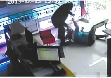 兩分鐘后,該名營業員爬起來,在柜臺內拖出凳子準備砸該男子,卻被男子抓住凳子,營業員也被按倒在柜臺上,被男子一頓毆打,隨后又被拖倒在地,背部和腿被踹了兩腳。