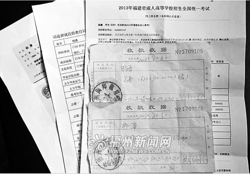 9月初,有個熊女士電話通知她8日去長樂教育局確認考生信息。“我去了,教育局說根本就查不到我的資料。熊女士又讓我9日去閩侯教育局確認考生信息,閩侯教育局的人說網上報名已經關閉,現在無法報名。”楊女士說,這時熊女士要求她改報網絡教育,還要補交1000多元,楊女士想退錢,對方說只能退2000多元。