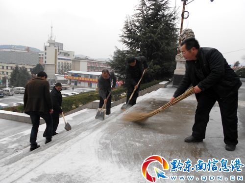 4日清晨,在該縣新興縣城,到處都能見到義務掃雪的人群。在縣政府廣場,縣四大班子領導手拿掃帚正忙得起勁。