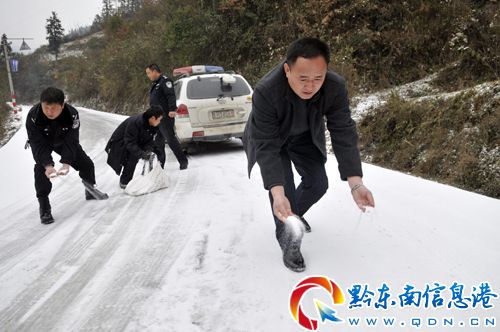 從巖埂坡角到山頂玉門坳,長達5公路山路上,龍世勇、黃置民和該縣交警部門同志,以及龍田、客樓兩地黨委政府干部30余人沿著公路撒鹽。