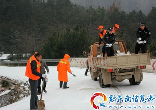 凱里公路管理局職工在省道202線坡坳路段進行撒砂防滑作業。(楊帆 攝)