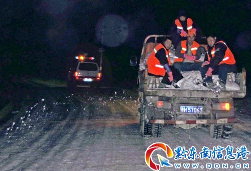 凱里公路管理局職工對(duì)省道310線K0至K16邦洞橋路段進(jìn)行撒鹽化冰作業(yè)(陳永林 攝)