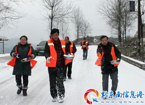 凱里公路管理局職工在省道202線K171+300處撒鹽化冰(顧紅春 攝)