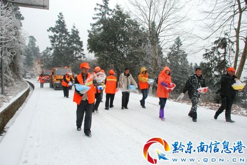 1月9日夜至10日清晨,因遭遇凝凍天氣“回馬槍”襲擊,黔東南州境內(nèi)省道308線排里坳路段路面再次出現(xiàn)結(jié)冰,導(dǎo)致車輛無法通行。10日上午,凱里公路管理局“雷山公路除冰保暢突擊隊(duì)”40多名路政、公路養(yǎng)護(hù)人員緊急在黔東南州海拔最高(1500多米)的省道308線196公里至206公里路段(排里坳路段)撒鹽化冰、鋪砂防滑,再戰(zhàn)“冰魔”。于10日中午12時(shí)30分打通了該路段,使20余臺(tái)各類車輛、300余人順利過境。