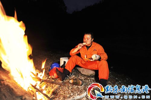 夜幕降臨,王炳益生堆火吃包餅干充饑
