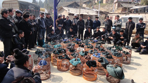 1月13日正逢臺江縣革一鄉趕集日,位于革一屯上村的籃球場上聚滿了各位愛鳥人士的愛鳥。