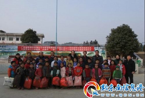 1月12日下午,寒風刺骨,丹寨縣金山小學在操場上舉行了“廣東省珠海市女子中學資助貴州省丹寨縣金山小學貧困學生物資發放儀式”。