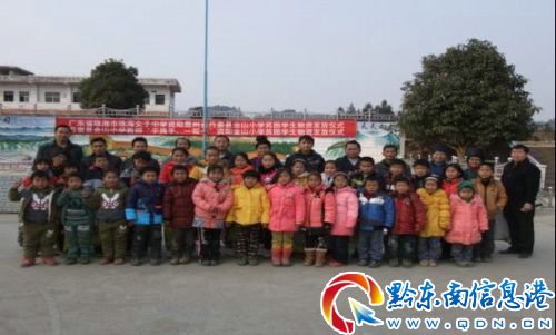 此次愛心物資發放儀式首先由丹寨縣金山小學校大隊輔導員張有勝老師主持,王紹邦校長公布貧困生名單。本次活動共用珠海女子中學資助資金4400元,為7個班級的25名學生購買新的棉衣、褲子和鞋;剩余的資助資金,該校將為這25位學生交納下學期的保險和訂購校服。