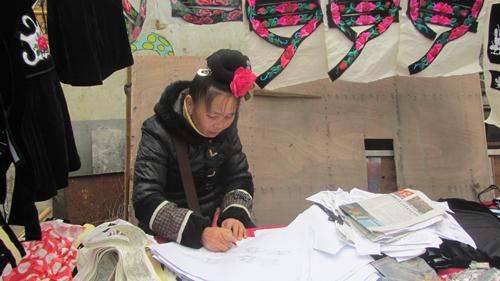 一條150多米的小巷上人群擁擠,230多個攤位上擺滿各式各樣的精美民族刺繡品,從絲線、印花、繡帶到一件完整的苗族衣服應有盡有深受人們喜愛。這里大部分賣主既是生產者,又是經營者。他們大部分來自農村,從農業生產勞動中脫產出來,從事本民族服裝的生產和經營,從中獲得收入,同時又方便照顧老人和娃娃上學。