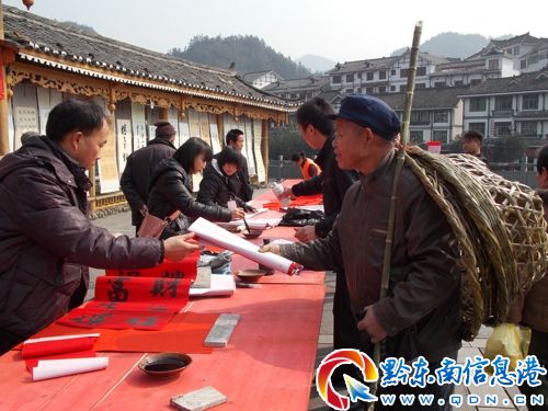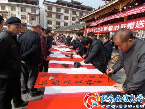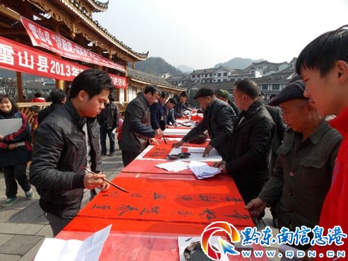 春節(jié)即將來臨,1月26日,雷山縣利用縣城趕場天,由中共雷山縣委宣傳部組織縣書法協(xié)會12名書法老師(其中,年齡最小的18歲,最高的60歲),在縣城木鼓廣場開展“雷山縣2013年新春對聯(lián)贈送活動”,深受群眾歡迎。