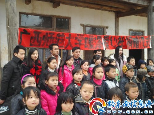 此次寒假愛心捐贈活動,由廣西師范大學教育科學院大學生志愿者吳東寶組織,該校5名大學生志愿者隨同參加。