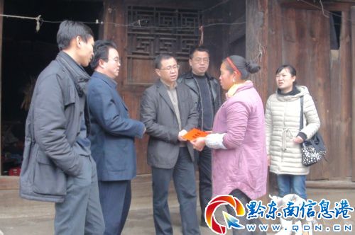 節前送溫暖,真情暖民心,為進一步落實科學發展觀,緊緊圍繞保障和改善民生工作主線,做好困難群眾的生活保障工作,構建社會主義和諧社會,在春節即將到來之際,凱里經濟開發區管委會常務副主任張雙紅,紀工委書記曾紀紅,國土資源分局局長楊光成,管委會副調研員、農村工作局局長龍生才一行到鴨塘看望慰問老黨員、五保戶、二女戶、困難戶以及百歲老人等,把黨和政府的關懷送到他們家中,為每戶送去了三百元慰問金和牛奶等慰問品,使他們過上一個歡樂、祥和、喜慶的新春佳節,鴨塘街道黨政領導班子成員和民政辦負責人陪同看望慰問,同時街道利用“雙語”宣傳車向群眾宣傳國家的有關政策和法律法規。