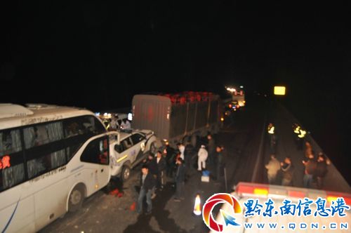 2013年1月27日19時(shí)21分,三穗縣消防大隊(duì)接到報(bào)警稱:滬昆高速上行線(湖南往貴陽(yáng)方向)1602+200M處多車發(fā)生追尾事故,有人員被困,請(qǐng)求救援。三穗大隊(duì)接到報(bào)警后,迅速出動(dòng)10名官兵分別乘坐1臺(tái)搶險(xiǎn)救援車和1臺(tái)指揮車趕往事故現(xiàn)場(chǎng)。