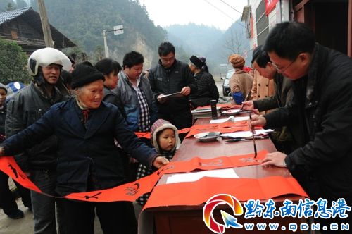 當天,錦屏縣委黨校和縣文聯組織縣書法協會會員,帶上筆墨和100多張大紅紙,為皇封村群眾書寫和贈送春聯200多副,同時向群眾贈送100多冊書籍。進入新年以來,錦屏縣組織幾支文化小分隊,分別到三江鎮、大同鄉、偶里鄉等鄉鎮開展“送文化進村寨”活動,為農村群眾送上精神食糧,也送去了新年的祝福。(楊秀廷 攝)