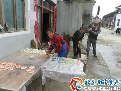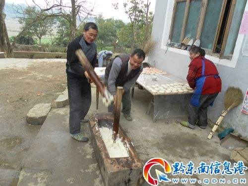 臨近春節,錦屏縣新化鄉家家戶戶殺年豬、打糍粑……紅紅火火年味濃。圖為村民在歡歡喜喜打糍粑的情景。(李必祥)