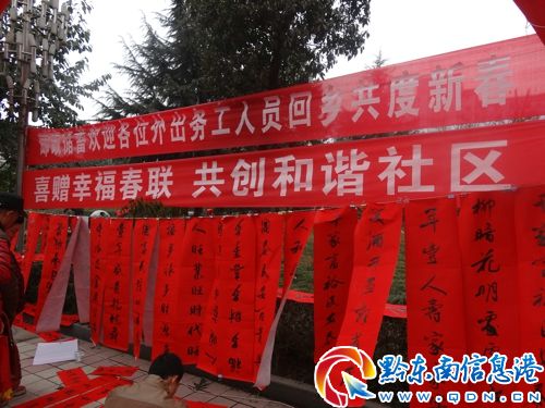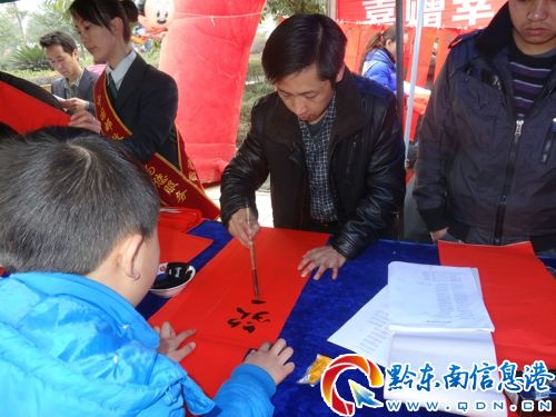 上午9點30分,該縣郵政局在政府廣場擺攤設點向廣大群眾宣傳郵政業(yè)務知識,贈送郵政小紀念品,并現場辦理郵政業(yè)務。該縣書法協會6位書法家在縣委常委、宣傳部長、書法家協會會長陳永祥的帶領下在擺開了"戰(zhàn)場",紛紛揮毫潑墨寫下一副副內容健康、時代感強的春聯,表達了和諧社會的贊美和新生活美好追求。活動現場氣氛活躍,深受廣大群眾的歡迎,吸引了眾多到縣城購置年貨的村民及返鄉(xiāng)農民工。
