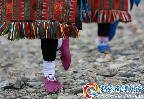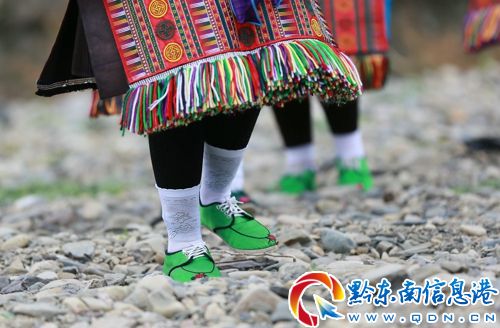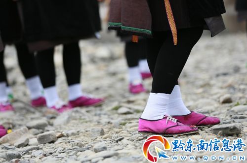 2月16日是貴州省丹寨縣南皋鄉償卡村一年一度的新春望會節,苗族村民們穿上傳統的盛裝及繡花鞋,踏著春天的氣息,伴隨著銅鼓樂聲翩翩起舞,各式的繡花鞋成了節日上的一道風景。圖為貴州省丹寨縣南皋鄉償卡村,苗族村民在跳銅鼓舞。(黃曉海)