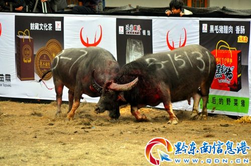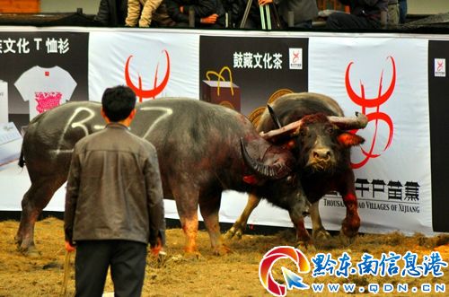 最后一輪比賽是“三足鼎立”的局勢,一足是“黃平小牛王”,另外兩足是“雷山第一碰”和“白虎三號”。“雷山第一碰”是雷山名牛,“家”住雷山報德村,“碰功”十分了得,在雷山縣境尚未遇到對手。“白虎三號”來自劍河,在當地也是小有名氣。