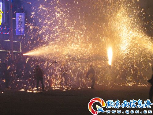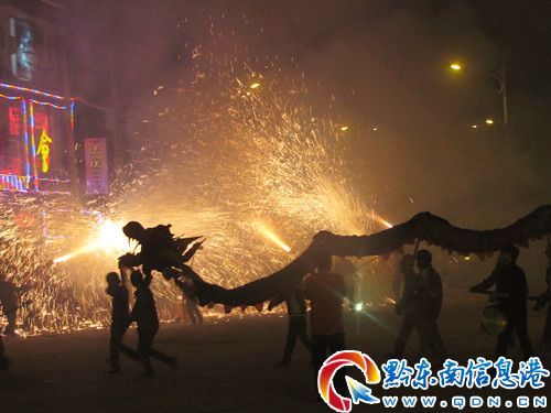 2月24日,是傳統(tǒng)的新春元宵節(jié)。傍晚17:00-18:00,雷山縣城城郊居民男女老少扶老攜幼,近3萬余眾從三村五寨陸續(xù)匯集縣城鬧元宵。晚上19:00開始,“咚咚鏘、咚咚鏘、咚咚鏘” 二十條龍匯聚縣城大十字,各顯神通、竭盡所能翻騰飛舞在縣城,表演給城鄉(xiāng)群眾觀看。接著,上百筒火藥筒從東南西北四個方向憤怒般吐著火舌熏向群龍,龍陣在呼嘯震天的火光中接受煙火的攻擊,此時,鞭炮、沖天炮、煙花炮齊鳴,滿天禮花、遍地響聲,萬眾齊歡。接著,群龍散陣,沖向不同的街巷,火筒、人群隨之而去,激烈的鞭炮聲、沖天的火焰光,在縣城各街巷此起彼伏,連接不斷,整個小縣城歡騰了……