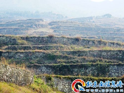 泥水梯田在云貴高原本是常見,但是重興鄉的這片梯田卻是完全由石頭堆徹而成,當天氣晴朗能見度好,在視野開闊的地方,就能看見連片的古石坎梯田環繞在巍峨的馬鞍山下,一片山田風光無限。專家們推測:“在幾百年前的古代,這片土地的人們為了保住水田不流失損壞,就用石頭堆徹來固定水田,由于技術高超,方法精湛,這些石頭如城墻一般,在經過幾世紀的風雨侵蝕后還依然屹立不倒。現在重興鄉的老一輩的苗家村民,也仍然過著男耕女織的傳統農業生活,石坎梯田、男人、耕牛、女人,農具就組成了簡單而樸實的家庭農業生活。”