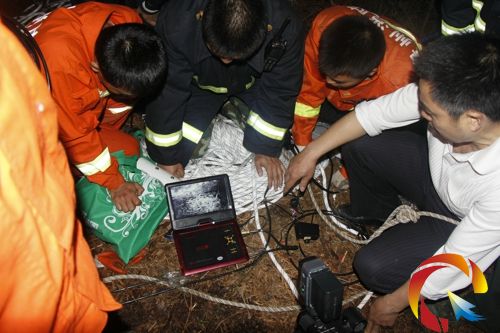 在保證自身安全情況下,盡快施救出被困人員,現(xiàn)場救援官兵立即調(diào)運大量的移動供氣源,安裝有線洞內(nèi)紅外攝像探頭,放入洞中觀察尋找被困人員情況。