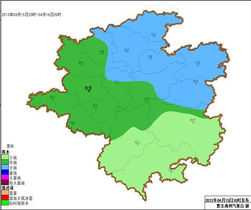 預計4月15日夜間多云轉陰,州中部以北地區有陣雨或雷陣雨,16日白天到夜間,全州多云轉陣雨或雷雨,州中部及以北部分鄉鎮有大雨,個別鄉鎮有暴雨,雷雨中局地伴有冰雹、大風、短時強降水等強對流天氣(具體降水以及強對流天氣落區見圖1)。