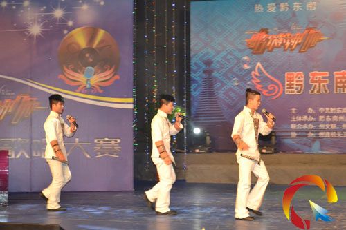 在今天下午的流行組比賽中,來自黎平代表隊的侗人組合也把現場氣氛帶到了另一個高潮。一首自選歌曲《苗鄉侗寨》和一首推薦歌曲《多彩侗鄉》,三個一身白色裝飾的小伙子的精彩演出,不禁讓人想起了2010年春晚重圓的小虎隊。優美的舞姿和清脆的聲音相互交織,他們也唱出了苗鄉洞賽的風韻,唱出了黔東南人自信的精神風貌。