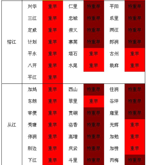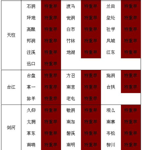 我州鄉鎮旱情等級維持。有142個鄉鎮為特重級氣象干旱,占全州鄉鎮71.3%;重級氣象干旱為51個鄉鎮,占全州鄉鎮的25.6%。重旱以上鄉鎮占全州鄉鎮的96.8%。旱情分布如下表所示: