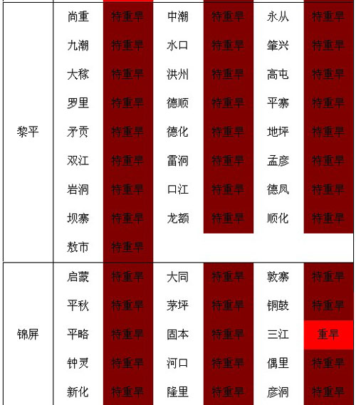 截止8月11日氣象干旱監測,我州岑鞏、鎮遠、黃平、三穗、臺江、劍河、黎平、天柱8縣為特重級氣象干旱,占全省特重旱縣(市)的25.8 %;凱里、施秉、錦屏、雷山、榕江、從江、麻江7縣(市)為重級氣象干旱,占全省重旱縣(市)的20%;丹寨為中級氣象干旱。