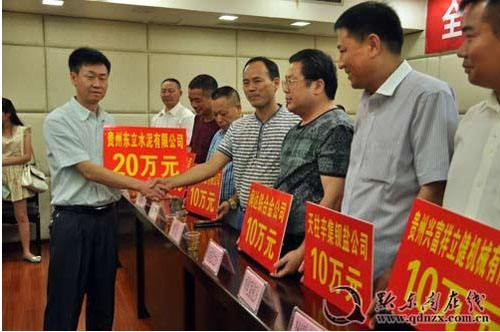 捐款現場,貴州東立水泥公司、鎮遠潤達鐵合金公司、貴州興富祥立健機械公司等21家企業紛紛獻出愛心,踴躍捐款,現場籌集善款共計110.3萬元。企業家們表示,希望通過此舉獻出綿薄之力,幫助受災人民,希望他們戰勝困難,重建家園。