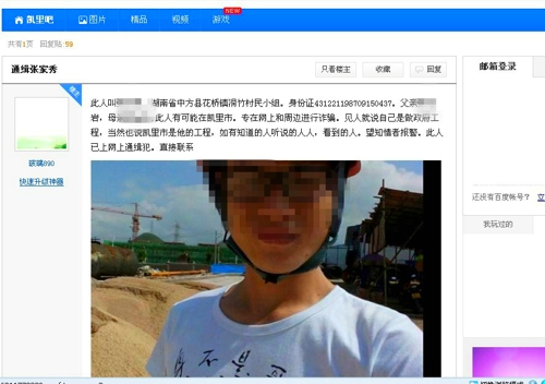 據介紹,10月5日,黔東南州公安局的民警在工作中發現,一名江西網友在 “凱里貼吧”發布一篇題為“通緝張某某”的貼子。“通緝令”公布了張某某(男,25歲,湖南省懷化市中方縣人)的身份信息,稱其有可能在凱里活動。還曝光了張某某的騙術:以做政府工程為名在網絡上以及周邊區域行騙……