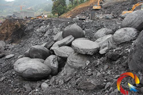 記者在現(xiàn)場(chǎng)看到,挖出的“石蛋”集中擺放在工地上,這些石蛋質(zhì)地黑灰色,表面有光澤,大小不一。不少“石蛋”正面呈圓形,側(cè)面呈橢圓狀。另有部分“石蛋”已經(jīng)破損,施工工人說,這是開挖時(shí)被機(jī)械壓破的。