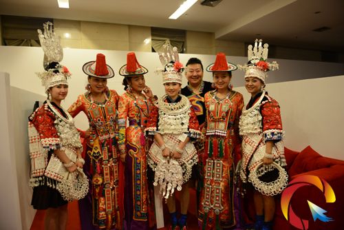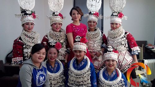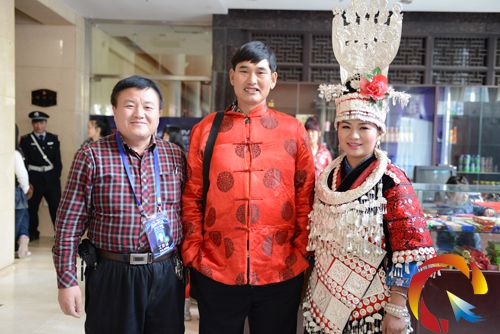苗族姑娘和塔斯肯、蘑菇兄弟組合合影